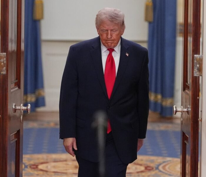 President Trump speaks from the Cross Hall of the White House on Wednesday. Trump used the prime-time address to update.
