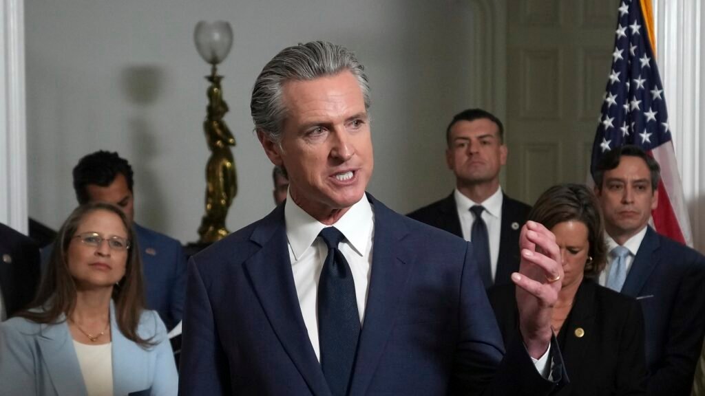 Accompanied by California and Texas lawmakers, California Gov. Gavin Newsom speaks in support of the Texas Democratic lawmakers for their walkout to block a vote on a congressional redistricting plan sought by President Donald Trump, during a news conference in Sacramento, Calif., Friday Aug. 8, 2025. Rich Pedroncelli/AP hide caption toggle caption Rich Pedroncelli/AP SACRAMENTO,