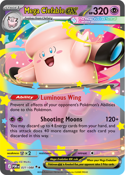 When Lillie’s Clefairy ex’s Fairy Zone Ability adds a Psychic-type Weakness to Dragon-type Pokémon, Mega Clefable ex can even Knock Out Dragapult ex or Mega Dragonite ex in one hit, too. With its Luminous Wing providing protection from the effects of Abilities, and Supporter cards like Wally’s Compassion and the new Jacinthe providing healing, Mega Clefable ex could be taking these Knock Outs turn after turn.