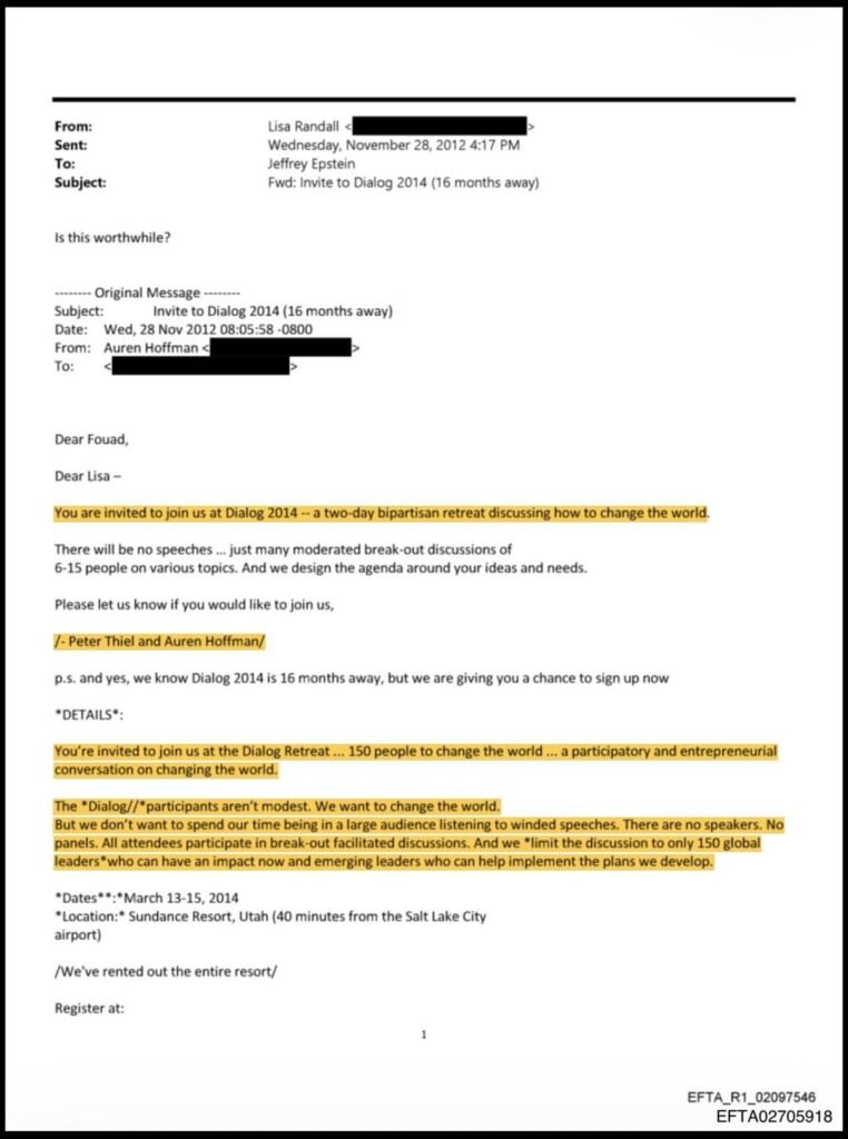 Epstein being asked if this Dialogue Retreat is worth attending. Email says it’s “100% off-the-record”. Giant list of names including Peter Thiel & many more.