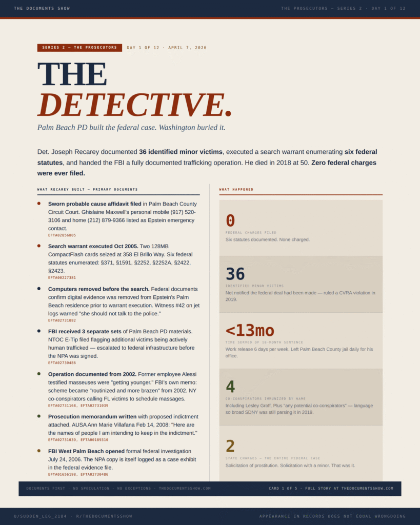 Federal records confirm computers were removed from Epstein’s Palm Beach residence before Palm Beach PD executed their search warrant. The detective who documented 36 minor victims and six federal statutes died in 2018. Zero federal charges filed.
