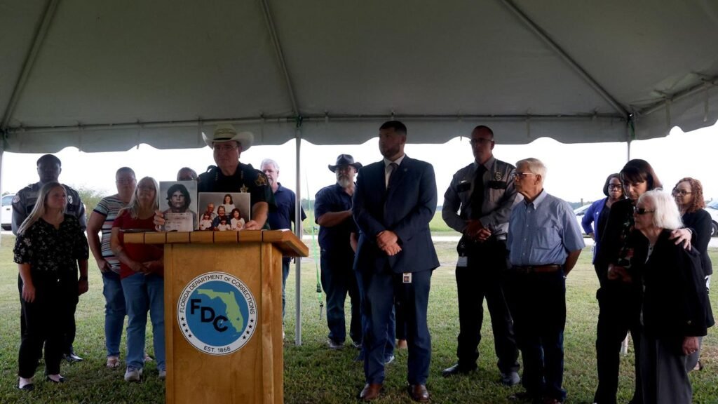 The sister of Barbara Knowles watches as the Polk County Sheriff, Grady Judd, announces the death of David Pittman. The execution was carried out at Florida State Prison on Wednesday, Sept. 17, 2025.