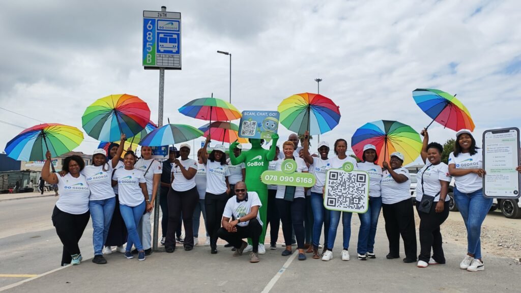 Western Cape MEC for Mobility, Minister Isaac Sileku, featured at the GO GEORGE venue at TRUNS, where he officially launched GoBot – the newest addition to the GO GEORGE bouquet of information channels. He is featured with Communication Champions, and other attendees, and props used to introduce the concept. GO GEORGE has launched a campaign