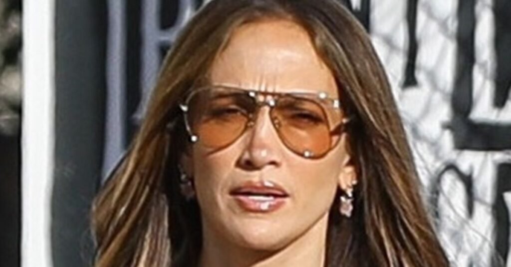 Stepping out for lunch at San Vincente Bungalows in West Hollywood, J.Lo was spotted wearing a pale pink silk dress. The maxi silhouette featured a plunging V-neck and lace-trimming that extended from the straps to the hem. She paired it with brown suede cowboy boots for a boho-chic look. For accessories, she opted for her go-to wire-frame aviator sunglasses and a matching pink bag.