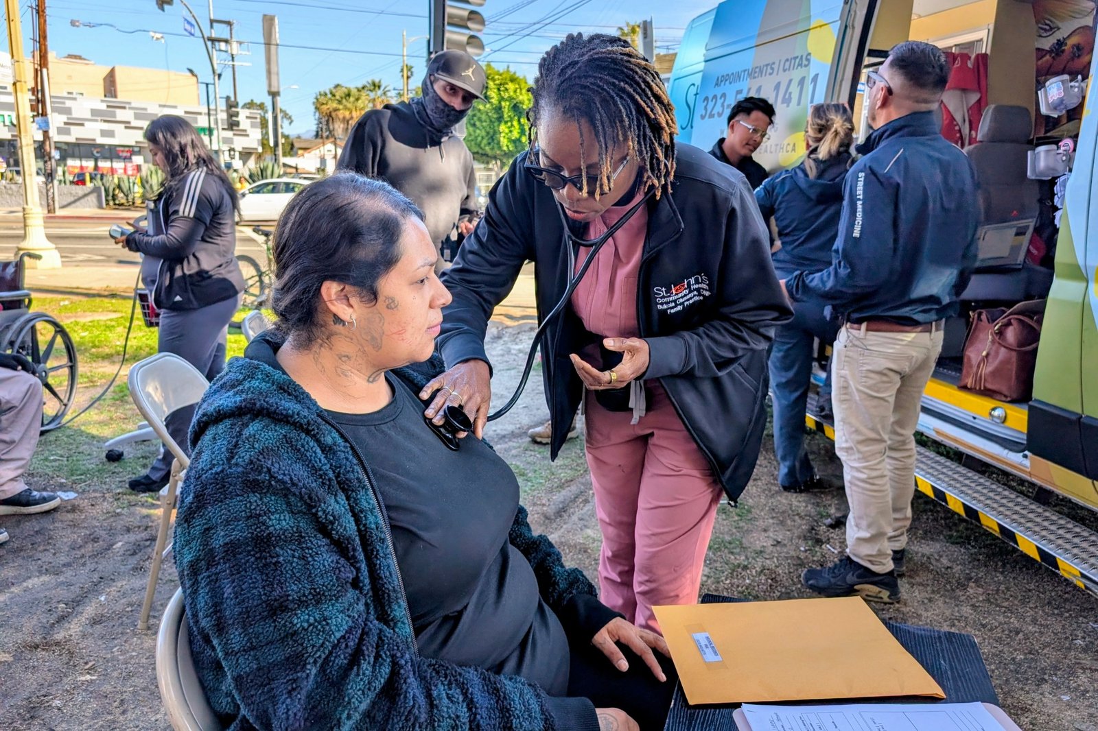 Mia Angulo, who is pregnant and due in May, is living in a tent with her boyfriend in the predominantly Latino Los Angeles neighborhood of Boyle Heights. Lingering pain from a car crash two months ago, on top of an already hardscrabble life, has Angulo worried about her pregnancy. So she was relieved when a mobile street medicine van from St. John’s Community Health pulled up near her encampment last month.