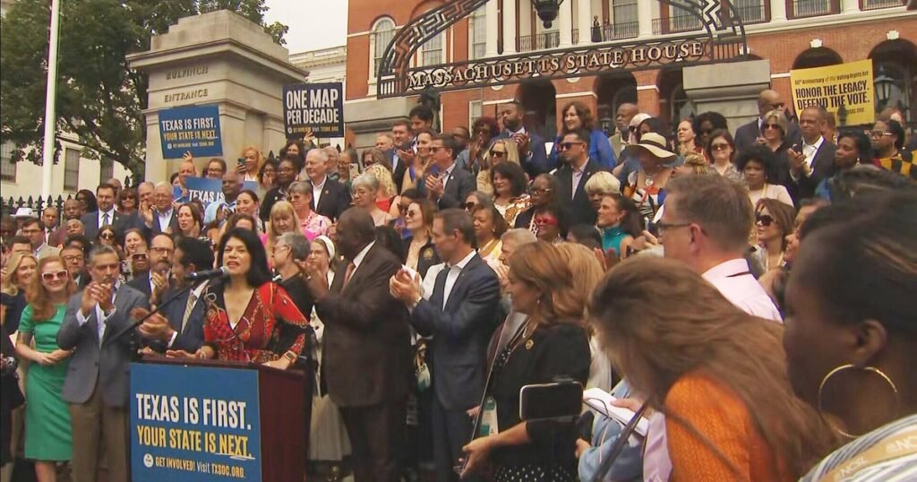 The Texas redistricting battle landed on the steps of the Massachusetts State House in Boston Wednesday.