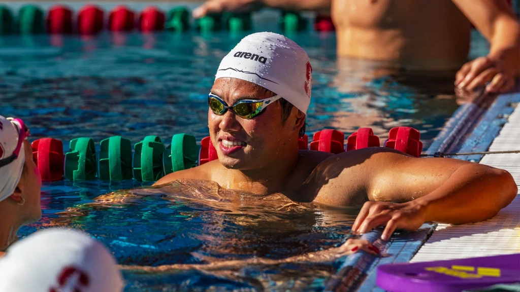 Gu won twice on Friday: first in the 50 free with a 19.13 (a personal best), and he was on the third leg of Stanford’s 400 medley relay win that posted a 3:03.89. Finn Harland opened up the race in the first leg, with Fan, Gu, and Dupont Cabrera following.