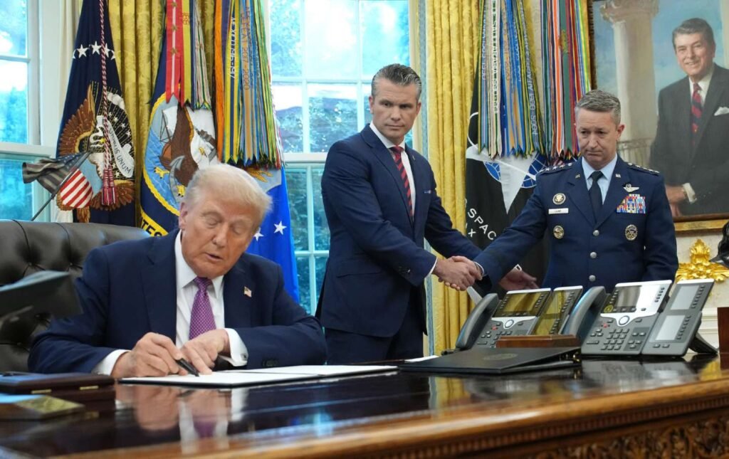 President Donald Trump signs an executive order renaming the Department of Defense as the Department of War as Defense Secretary Pete Hegseth (C) and Chairman of the Joint Chiefs of Staff Air Force Gen. Dan Caine shake hands, in the Oval Office of the White House on September 5, 2025, in Washington, DC.